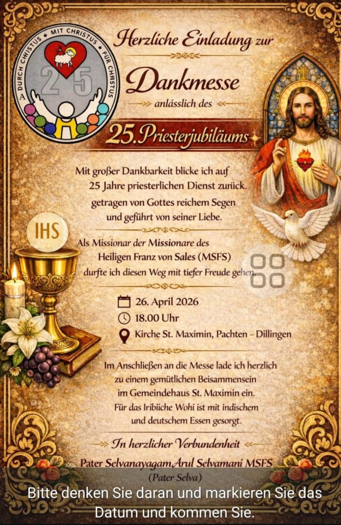 Am Sonntag, den 26.04.2026, gestaltet unser Chor die Messe zum 25.sten Priesterjubiläum von Pater Selvanayagam Arul Selvamani (Pater Selva) mit. Wir studieren dafür die Missa festiva des zeitgenössischen deutschen Komponisten Hubert Zaindl ein.